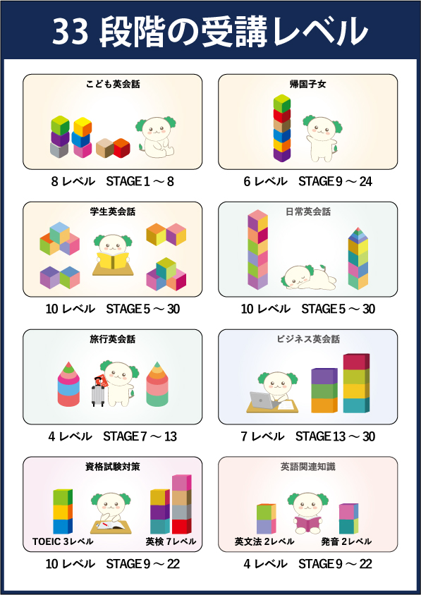 - 無料カウンセリングで、50種類のコースと33段階のレベルから受講コースを選びます。