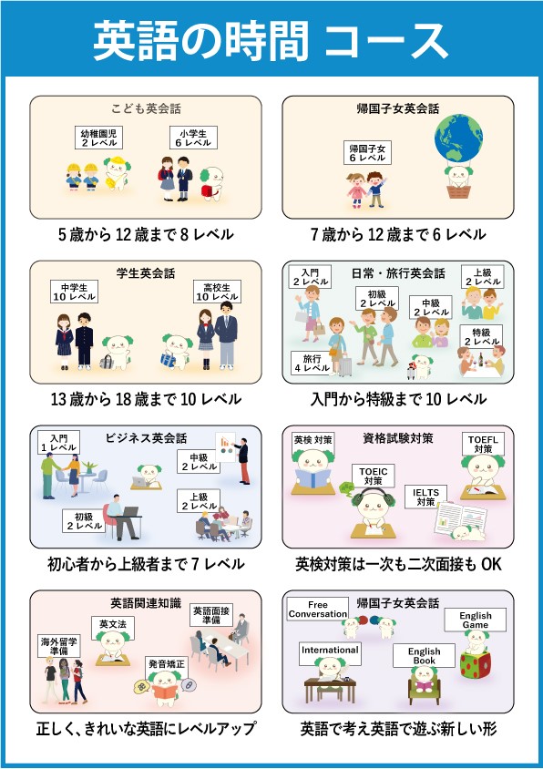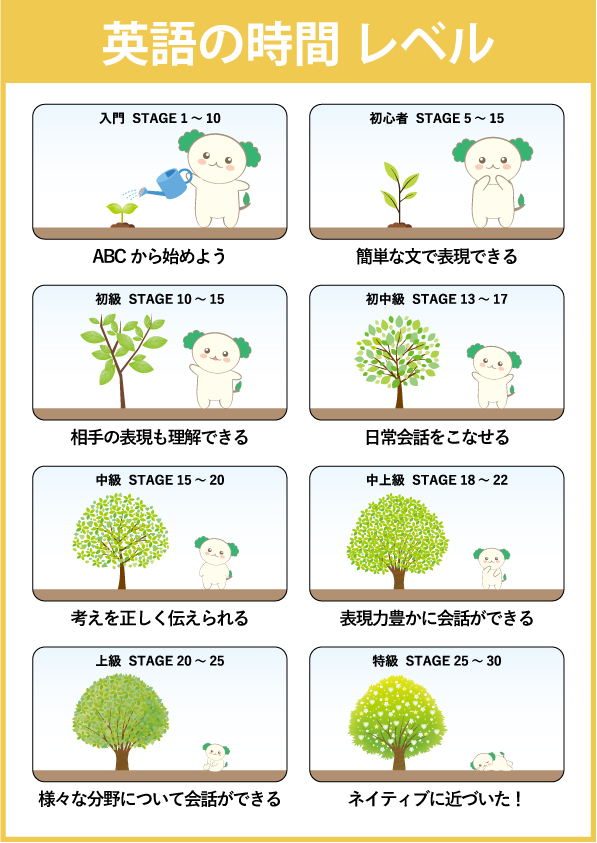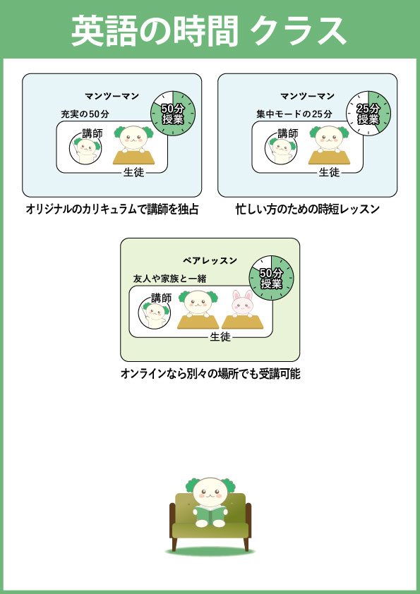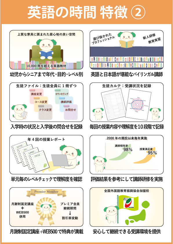 - 英語の時間の特徴は20種類、様々なメリットをオリジナルキャラクターのLeafyが1分間のビデオでご案内します。