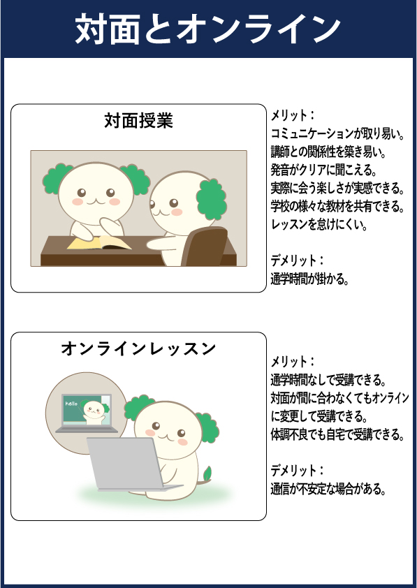 - 対面授業が難しい生徒様は、24時間前までにオンラインに変更する事も可能です。